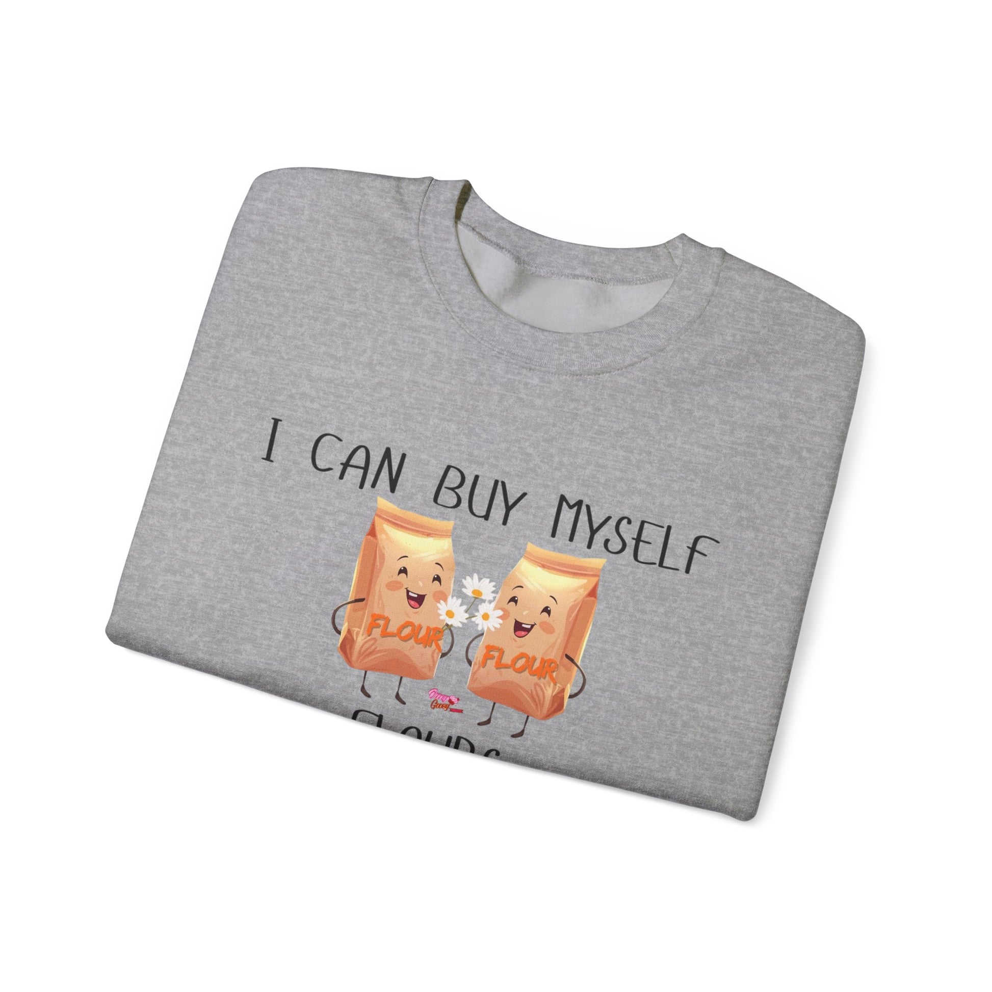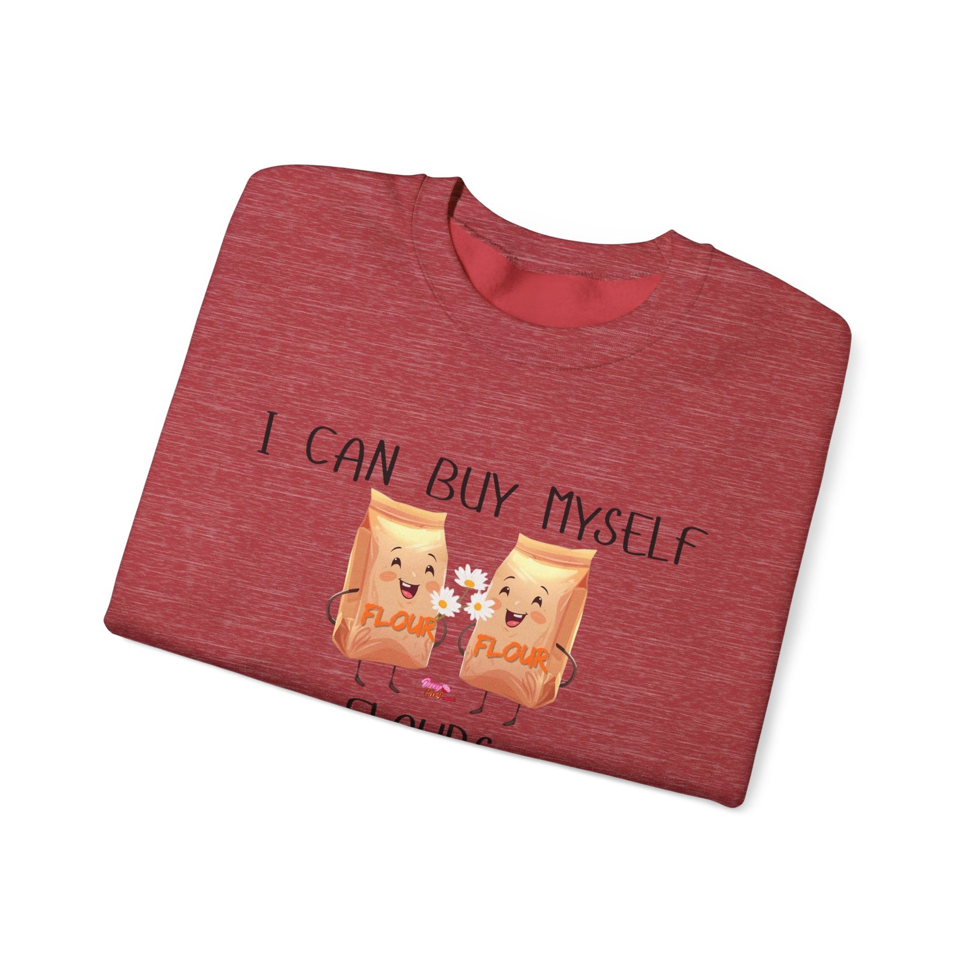 A funny sweatshirt that says 'I can buy myself flours', perfect for adding a touch of humor to your wardrobe. This cozy sweatshirt is ideal for adults looking for comfort and style in their everyday wear. Great for casual outings and lounging around the house, it makes a unique gift for birthdays, holidays, or just because.