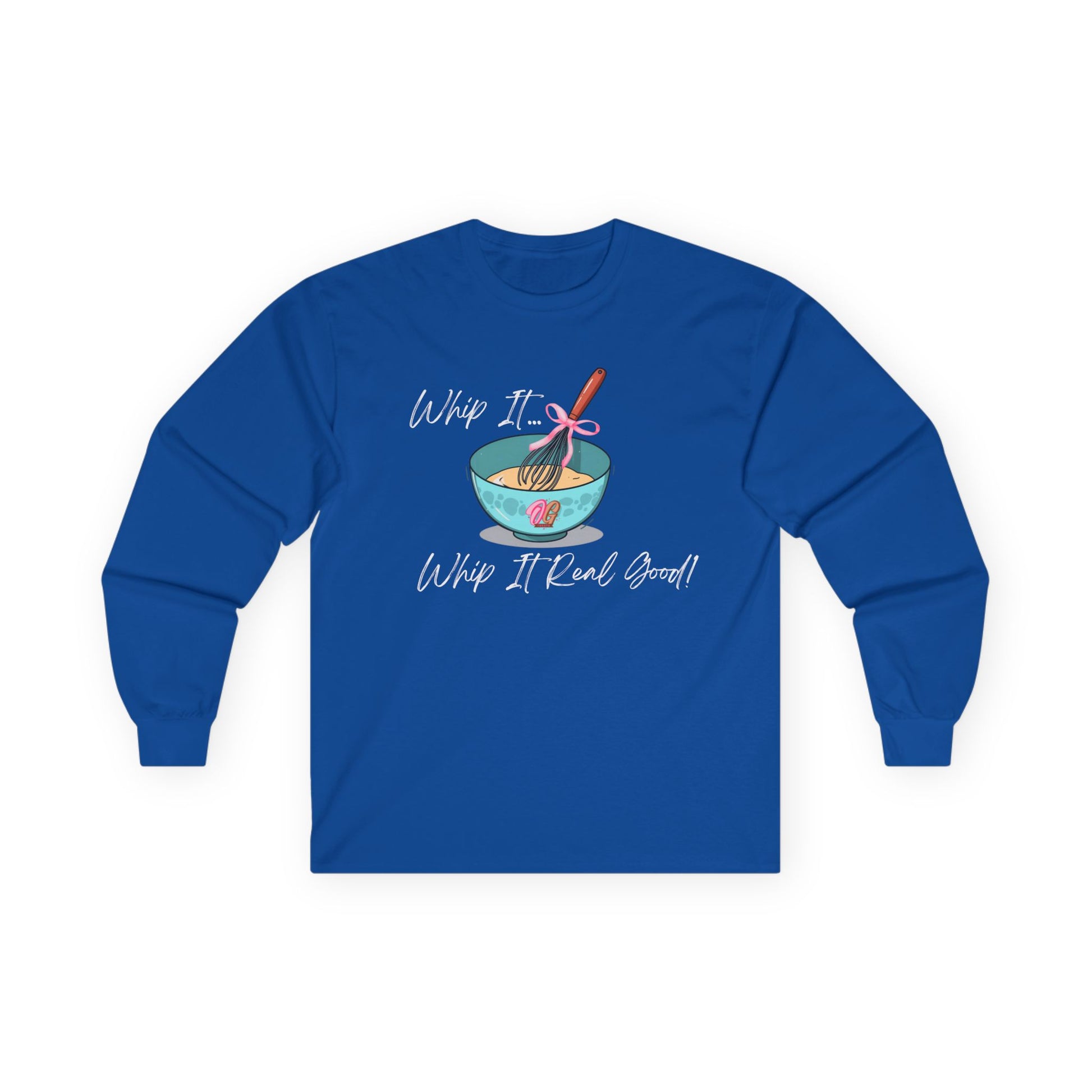 Mix up style and humor in the kitchen (or anywhere) with this playful long sleeve tee! Featuring the bold phrase “Whip It, Whip It Real Good,” this shirt is perfect for bakers, chefs, or anyone who loves a good pun.
